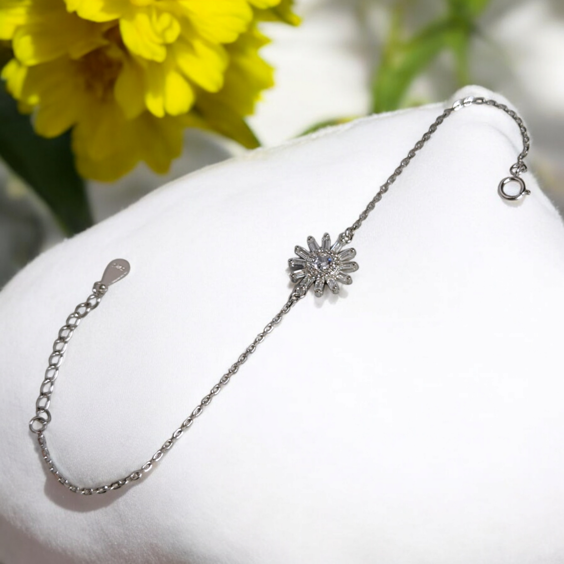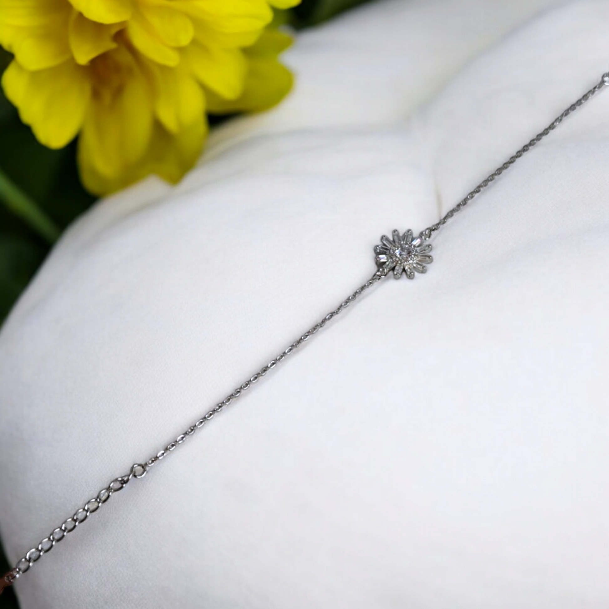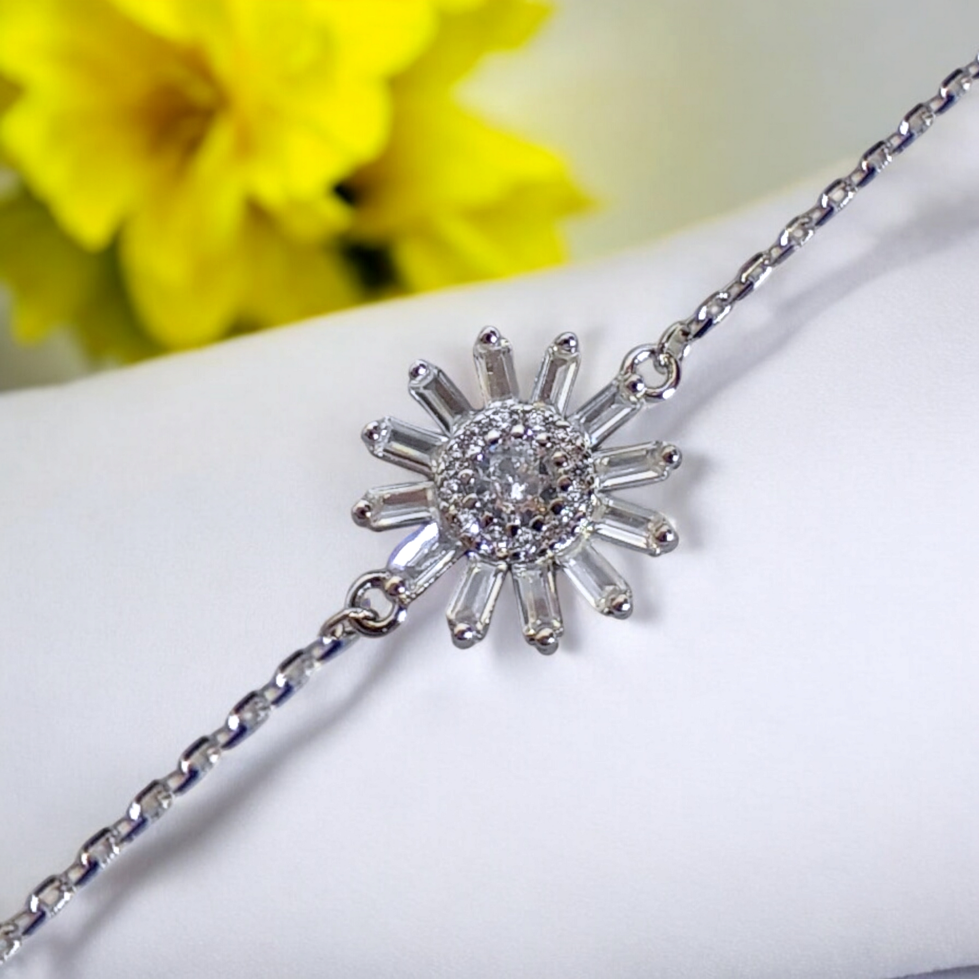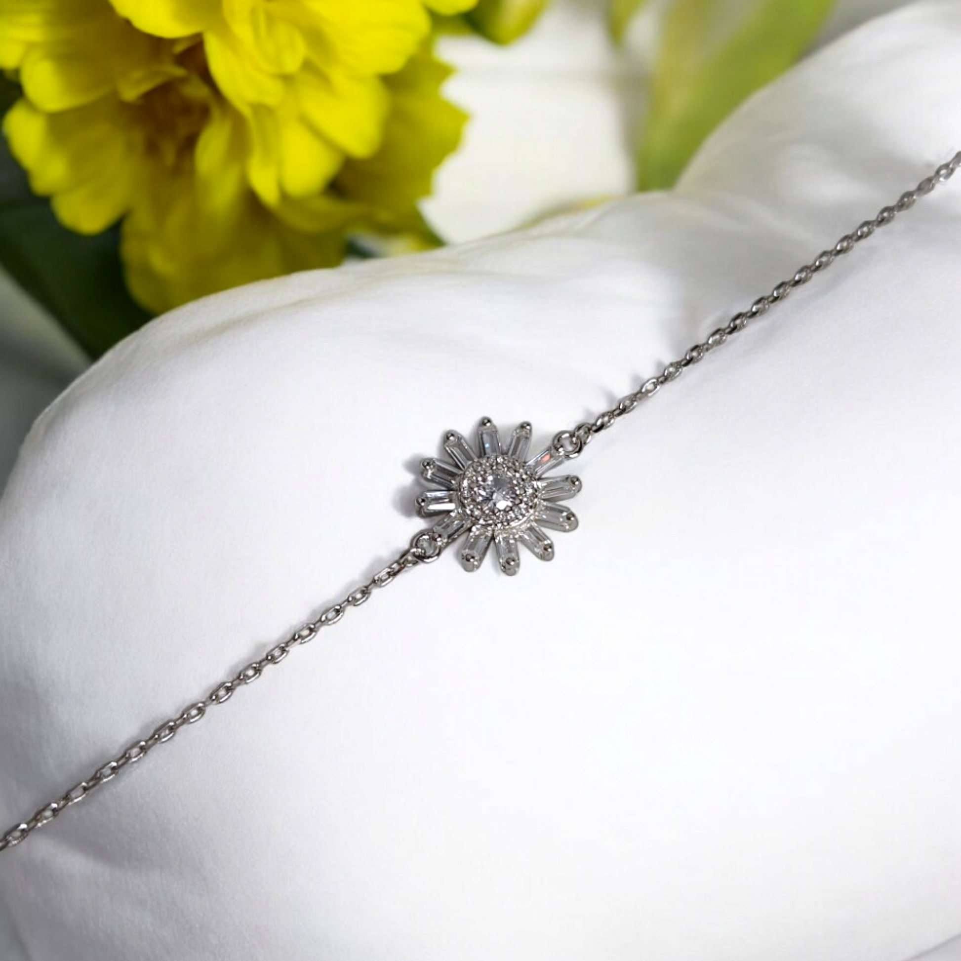 A graceful silver bracelet adorned with baguette-cut stones, capturing the essence of blooming floral elegance.