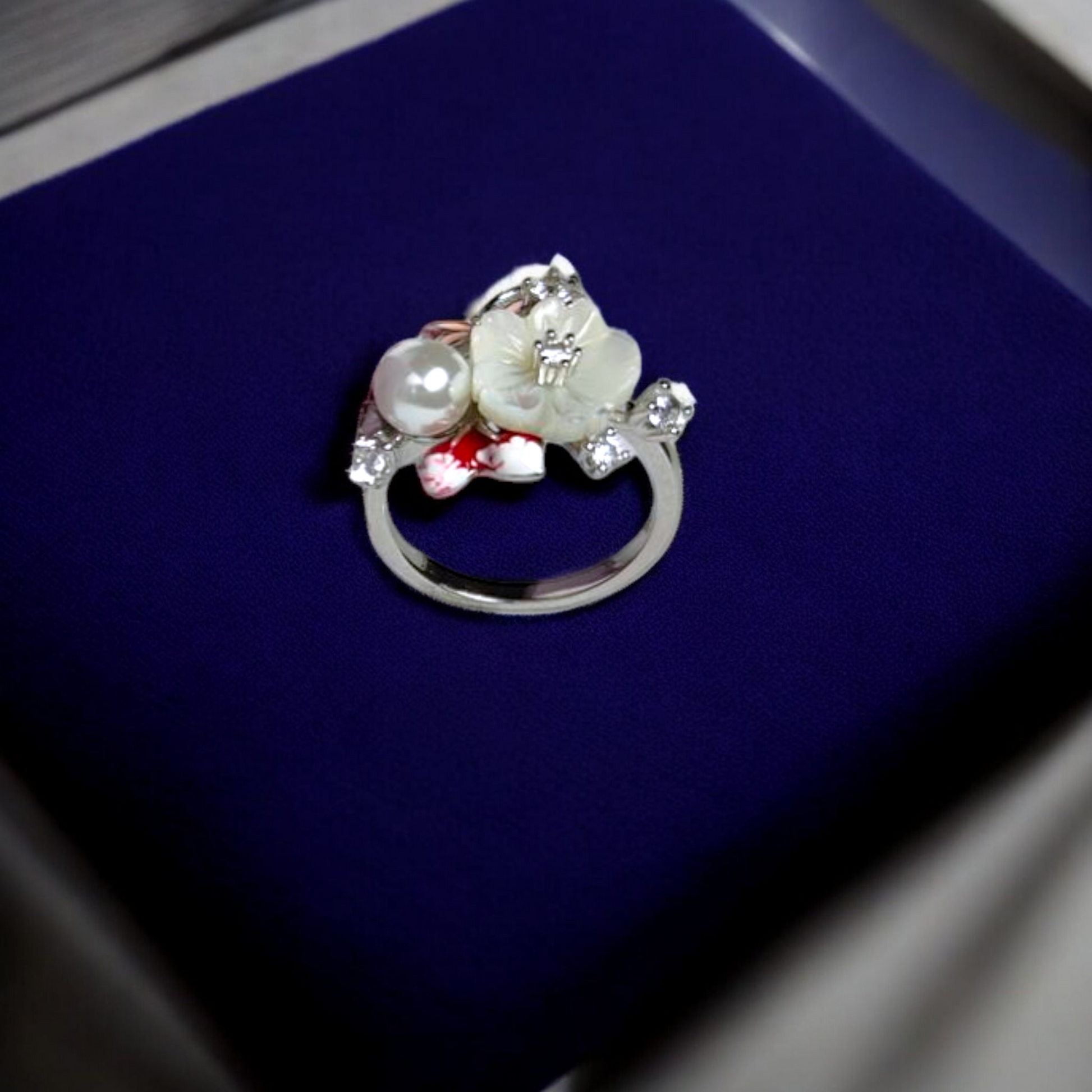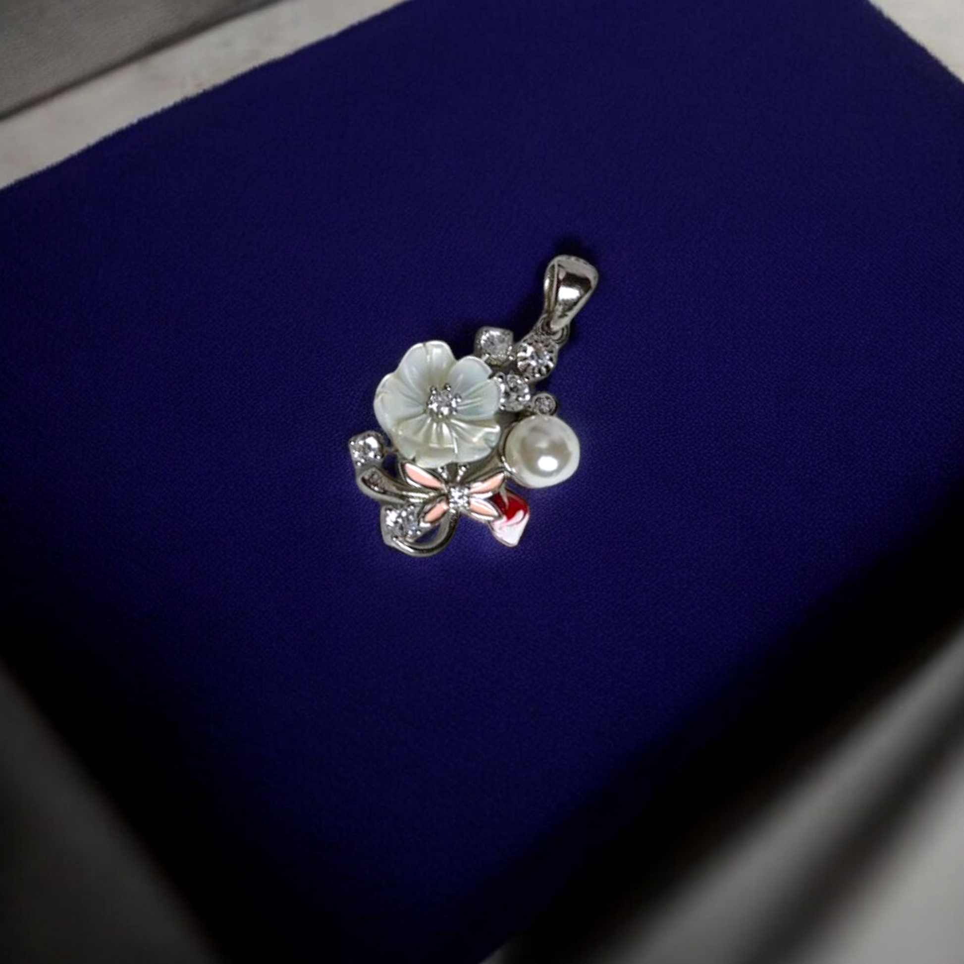 Inspired by the grace of blooming flowers, this exquisite jewelry set features hand-carved mother-of-pearl blossoms accented with shimmering cubic zirconia and dainty enamel butterfly details. Each piece—ring, earrings, and pendant—captures the charm of nature with its soft ivory petals and luminous pearls, creating a sophisticated yet playful touch. The silver base enhances the brilliance of the design, making this set a perfect choice for both everyday elegance and special occasions.