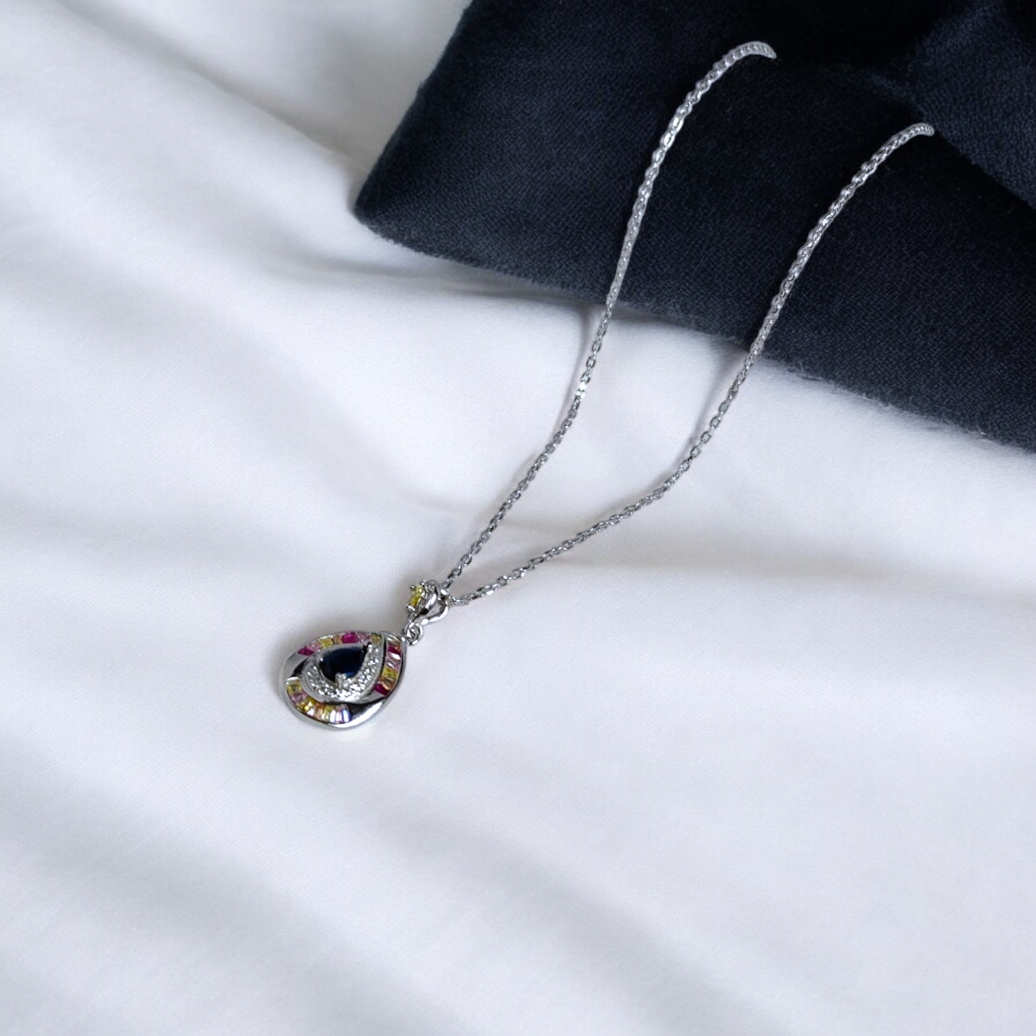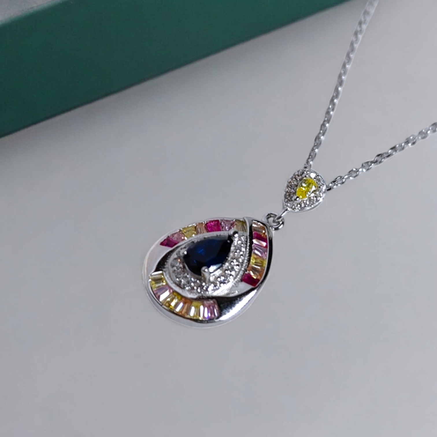 The Elegant Teardrop Sapphire Necklace features a deep blue sapphire at its center, encased in a shimmering halo of diamonds and multicolored gemstones. This exquisite design blends luxury and sophistication, making it a timeless statement piece.