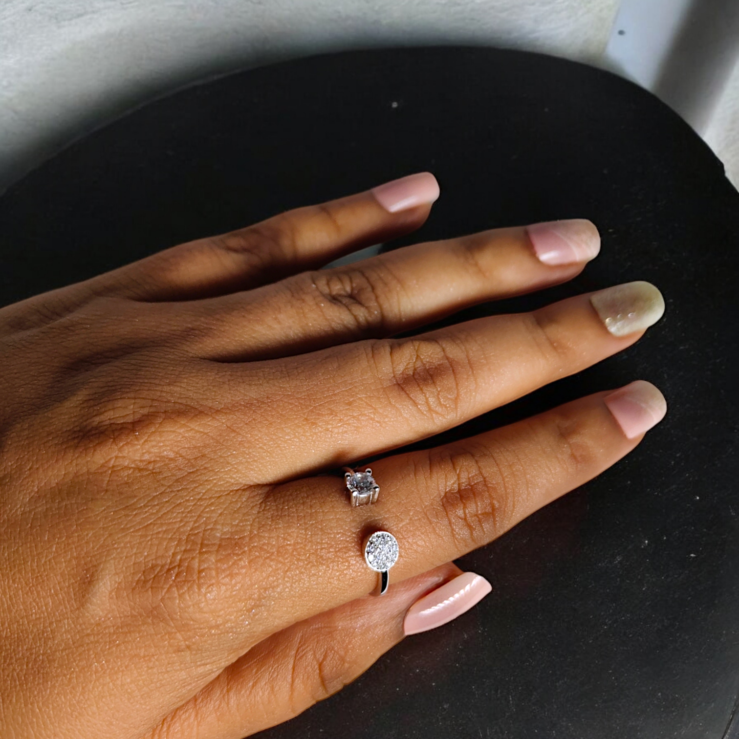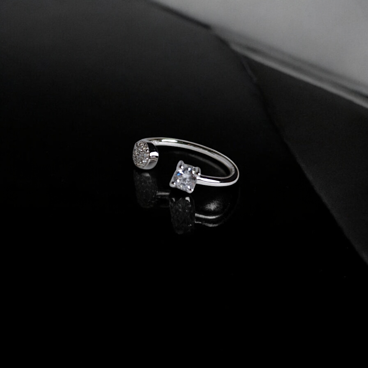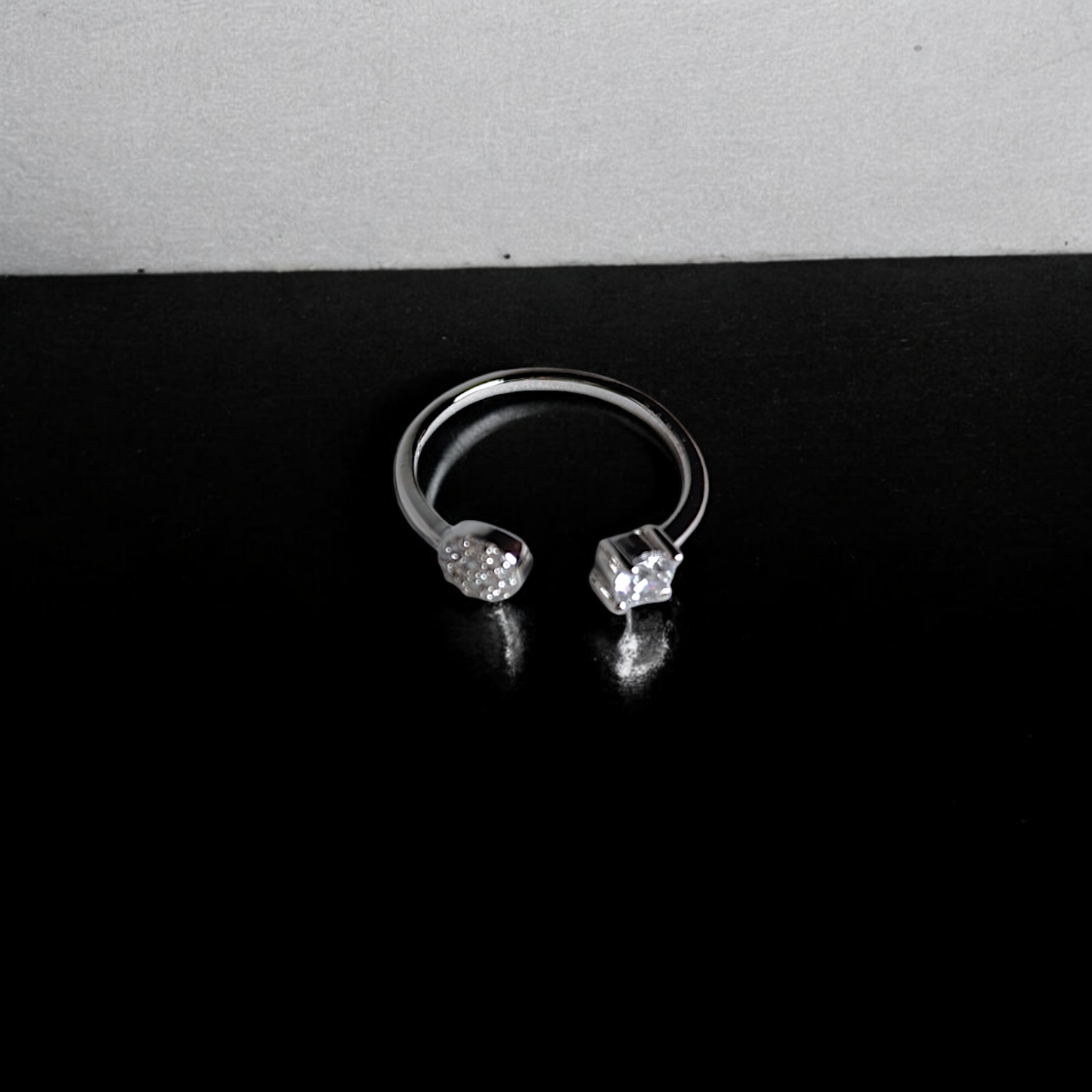 The Modern Edge Open Ring redefines contemporary chic with its asymmetrical design. One end features a brilliant princess-cut cubic zirconia, while the other showcases a pavé-set circular detail. This adjustable open band is perfect for stacking or wearing solo for a striking, minimalist statement.