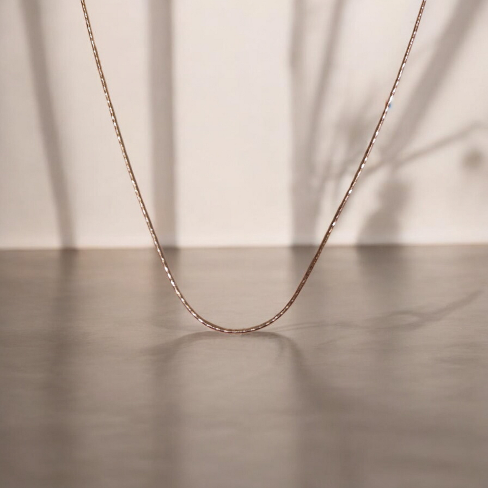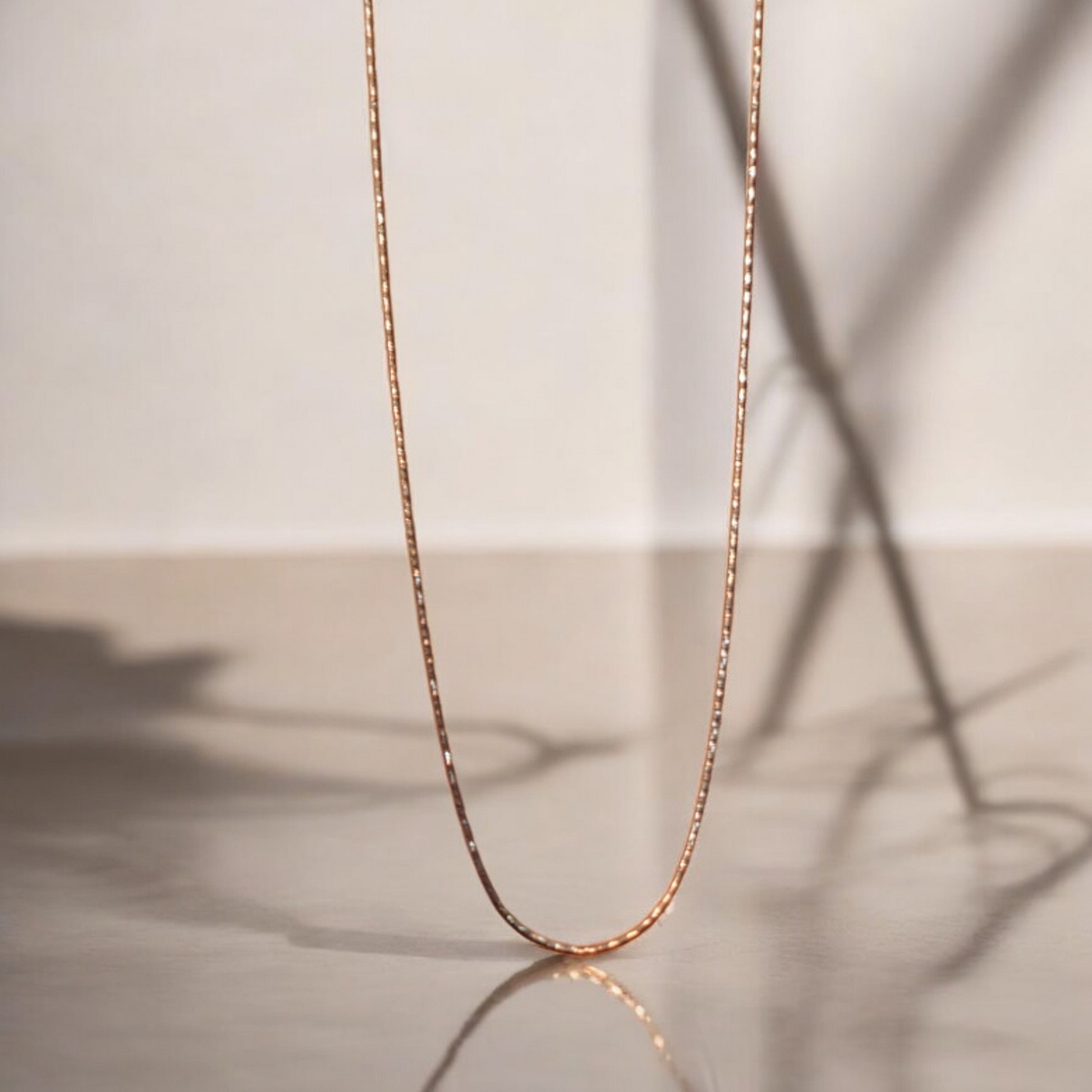 Exquisitely crafted from sterling silver and plated in a warm, rose gold finish, this delicate chain is a true embodiment of elegance. Its fine structure and minimalist design make it a versatile piece for layering or wearing solo. The subtle sheen of the rose gold enhances its charm, making it a must-have for any jewelry collection.