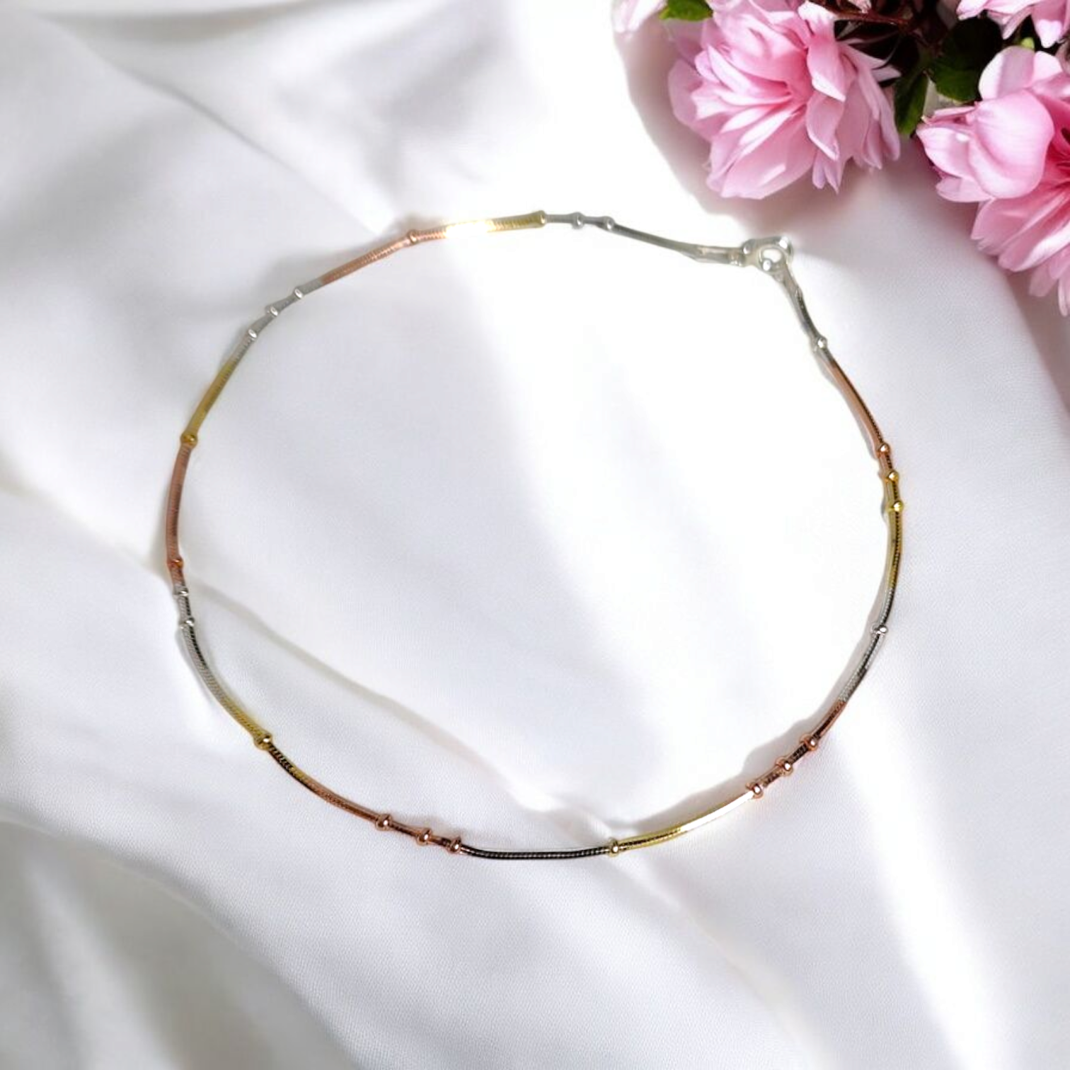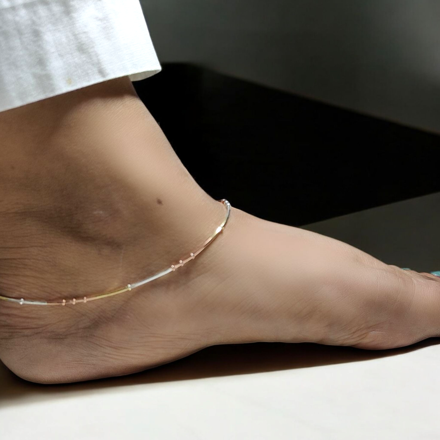 This anklet features an elegant fusion of silver, gold, and rose gold finishes, creating a graceful statement that complements every skin tone and outfit. Whether styled solo or layered, this versatile anklet adds a touch of refined shimmer to both casual and festive looks.